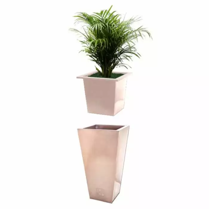 This insert has been created to fit inside the Extra Large Flared Square Copper Finish Planter. Due to its contemporary design, it can also be used as a separate pot in its own right. It has been designed to reduce the internal volume of the planter by creating a shelf which the contents can sit on. This allows you to display smaller plants and shrubs, whilst decreasing the amount of compost or aggregate required, saving you both time and money. The clean lines of both the planter and the insert, along with their stunning copper finish aesthetic, blend well with foliage, slate, and stone. They also look stunning set off against box balls, vibrant flowers, and white-washed walls, making this planter insert absolutely essential for the style-conscious gardener.