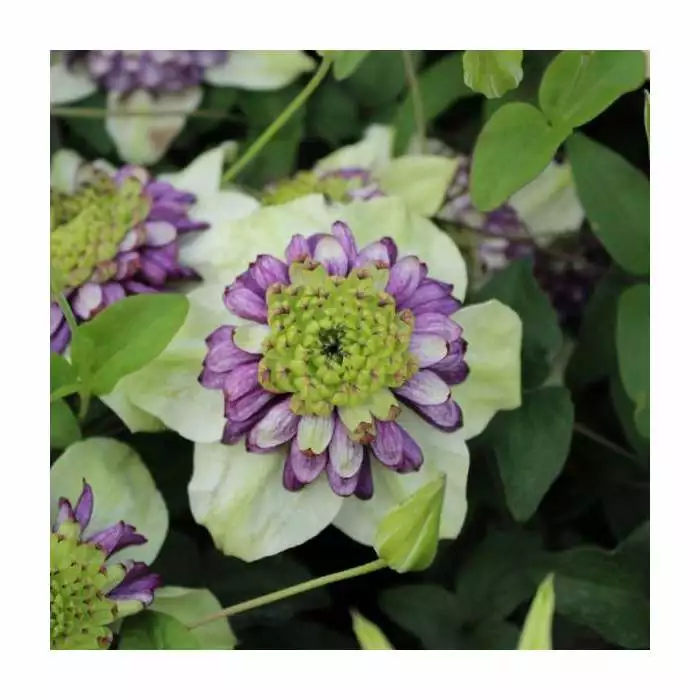 A versatile Clematis producing unique white, purple, and green flowers