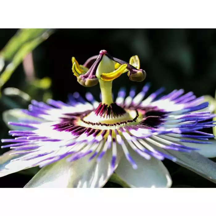 The Blue Passion Flower is a highly unusual and exotic semi-evergreen climber. From July to September it blooms and produces gorgeous large white flowers with central filaments of purple and blue surrounded by dark-green glossy foliage. This is followed by egg shaped orange fruit which is edible but is not particularly tasty as the Blue Passion Flower is mainly grown for its showstopping flowers.