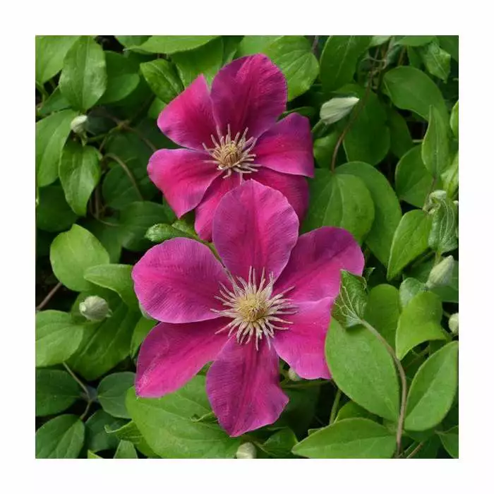 Masses of magenta flowers cover the whole plant from May into June. Being a compact variety Acopolis if the perfect clematis for a container on a small obelisk.