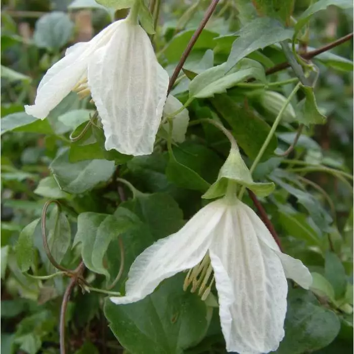 Exquisite fragrant creamy flowers. Position: full sun or partial shade Soil: fertile, well-drained, neutral soil Rate of growth: average to fast Flowering period: December to February Hardiness: frost hardy (needs winter protection) Small, creamy, bell-shaped winter flowers, often tinged with green, and mid-green leaves retained throughout the year. This winter-flowering clematis is perfect for training over a pergola, doorway or arch, in a sunny, sheltered site. Although drought-tolerant it may not survive severe winters. Garden care: No routine pruning is necessary. If the spread of the plant needs to be restricted prune immediately after flowering, cutting back overlong shoots to healthy buds. Apply a slow-release balanced fertiliser and a mulch of well-rotted garden compost around the base of the plant in early spring.