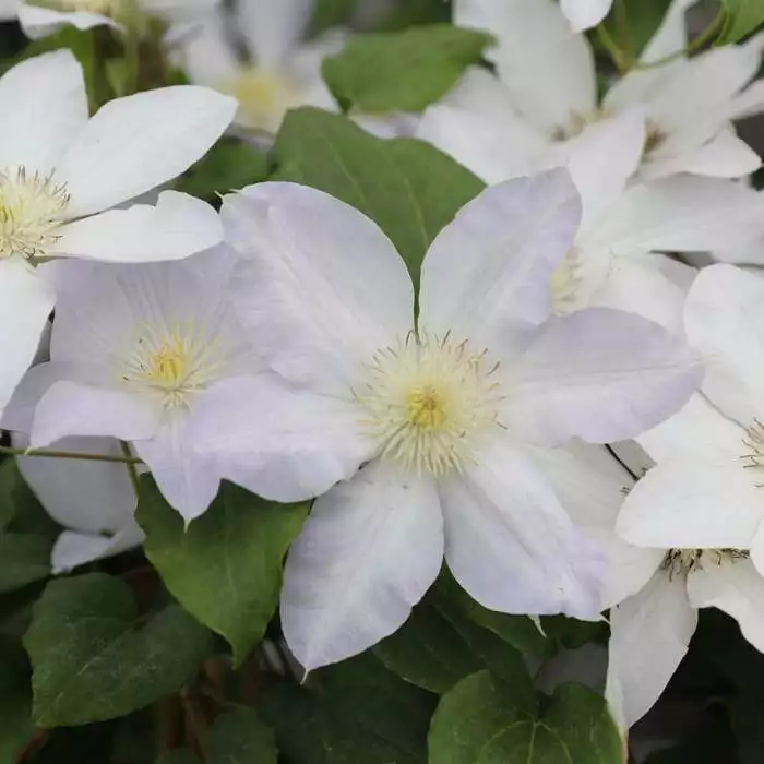 A blue-tinted white flowering deciduous climber . Position: full sun or partial shade Soil: fertile, well-drained, neutral soil Rate of growth: average Flowering period: May to June and September Hardiness: fully hardy Introduced in 2010, Ice Blue has lovely, big blue-tinted white blooms, perfect for that slightly shady spot in your garden. The flower colour is best retained over the lifetime of the bloom in partial shade. From the Prairie Series, this deciduous climber, has a flurry of flowers in early summer and then blooms intermittently later in the season. Garden care: Clematis prefer a moist, well-drained, humus rich soil with the roots and base of the plant kept cool and shaded by other plants or a layer of pebbles at the base. Ice Blue is a group 2 clematis, prune in February and after the first flush of flowers in early summer. Apply a slow-release balanced fertiliser and a mulch of well-rotted garden compost around the base of the plant in early spring.