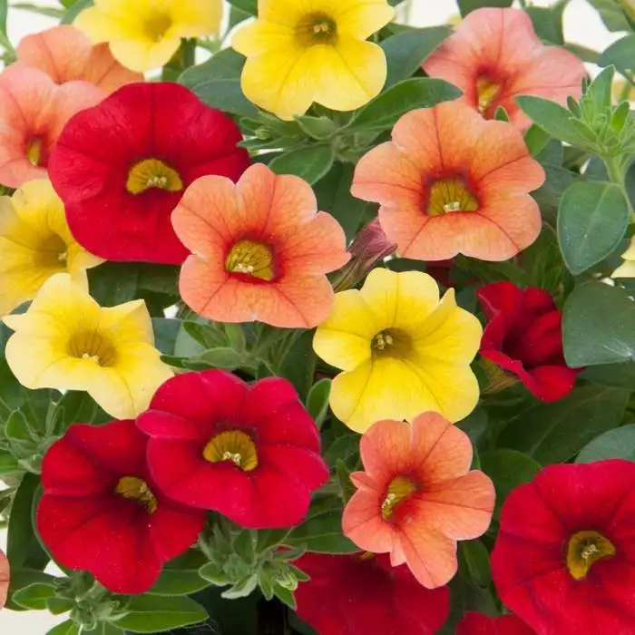 A warming blend of yellow apricot and scarlet flowering summer bedding plants. Position: full sun Soil: moderately fertile, humus-rich, well-drained soil Rate of growth: average to fast-growing Flowering period: June to the first frosts Hardiness: tender (needs frost protection) A delightful mix of Calibrachoa in shades of bright yellow, apricot and scarlet are combined for this wonderful early sunset collection. Each 9cm pot is planted with one of each of these specially selected varieties (ie. 3 plants per pot), and each pot will need to be spaced 10-15cm (4-6″) apart for good coverage. Please note that the hanging basket in the photograph is not supplied with the plants, but we do have a wonderful selection to choose from on our website. Garden care: Pinch out the growing tips to encourage bushier growth, and feed at regular intervals with a high-potash fertiliser throughout summer.