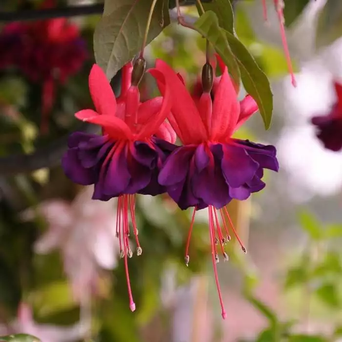 A large-flowered, trailing fuchsia with pendant, double purple and red blooms. Position: full sun or partial shade Soil: moderately fertile, humus-rich, well-drained soil Rate of growth: average to fast-growing Flowering period: May to the first frosts Hardiness: frost tender (will need winter protection) A large-flowered variety, ‘Maori Maid’ has wonderfully lush, double-pleated purple petals which blend into a vivid pink ‘sepal’, all dangling like a blooming ballerina. Strong growth makes it suitable for the growth of standards though this outstanding fuchsia is also ideal for draping over the edges of a pot or hanging basket. Garden care: To encourage growth, pinch out the growing tips of young plants after the sixth or seventh pair of leaves. During the growing season water regularly, and apply a balanced liquid fertiliser each month. Protect plants from frost, and overwinter potted plants in a conservatory or greenhouse.
