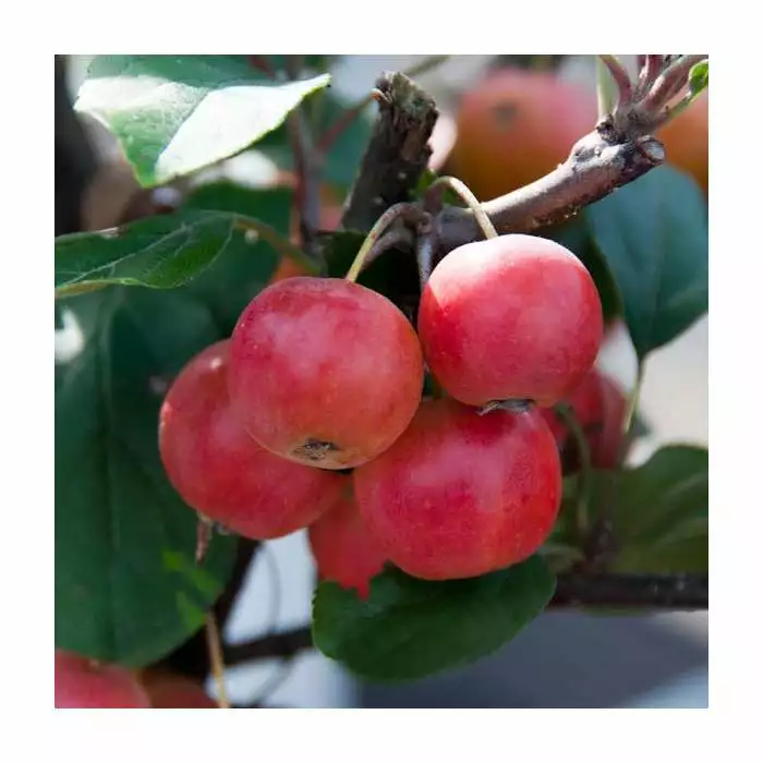 Malus x astrosanguinea ‘Gorgeous’ is a heavy-fruiting tree which produces distinctive glossy red fruits, which remain throughout autumn and into winter. As with all crab apples, ‘Gorgeous’ is very popular with bees, and thus will bring more pollinators into your garden, which is a blessing if you have other apple trees. ‘Gorgeous’ is especially good as a pollinator for all apple trees, and flowers throughout the pollination season, which gives it more chance to pollinate more trees. The fruits of this tree can sometimes be eaten fresh, although they can be sour. They are better stewed and used as jams, as they have high levels of pectin, which helps with the setting of jam.