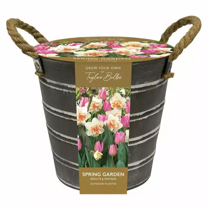 A gift set planter kit with complementary spring-flowering pink tulip and daffod. Position: bright light Soil: compost supplied Rate of growth: average Flowering period: November to April (depending on when planted) Hardiness: fully hardy Dimensions: 20cm D x 19cm H Expect a long-lasting, harmonious display of candy-pink Triumph tulips and sweetly-scented, fully-double, cream flowering narcissi (up to 50cm tall) as part of this gift set. Once the flowers have faded, the bulbs can be planted out in the garden where they will continue to produce their complementary flowers each spring. After purchase store in a cool and dry place. This kit comes complete with a decorative metal pot, 3 x Narcissus ‘Replete’ bulbs, 3 x Tulipa ‘Mistress’ bulbs, potting compost and clear instructions to create a beautiful display for your home. Outdoor growing instructions: Making the compost – place the peat-free compost pellets in a suitable mixing container and add 1400ml of lukewarm water. Allow to stand and expand for 30-60 minutes, drain off any excess water and mix compost well. You may have more compost than you require and more water could be required if the compost mix is looking dry. How to plant (from August onwards): Half fill the planter with the compost. Place the bulbs with the nose upright and cover with more compost. Water sparingly so the compost is moist. Be careful not to overwater. Place the planter outdoors in a sunny sheltered position. Remove faded flowers regularly. Keep compost moist at all times.