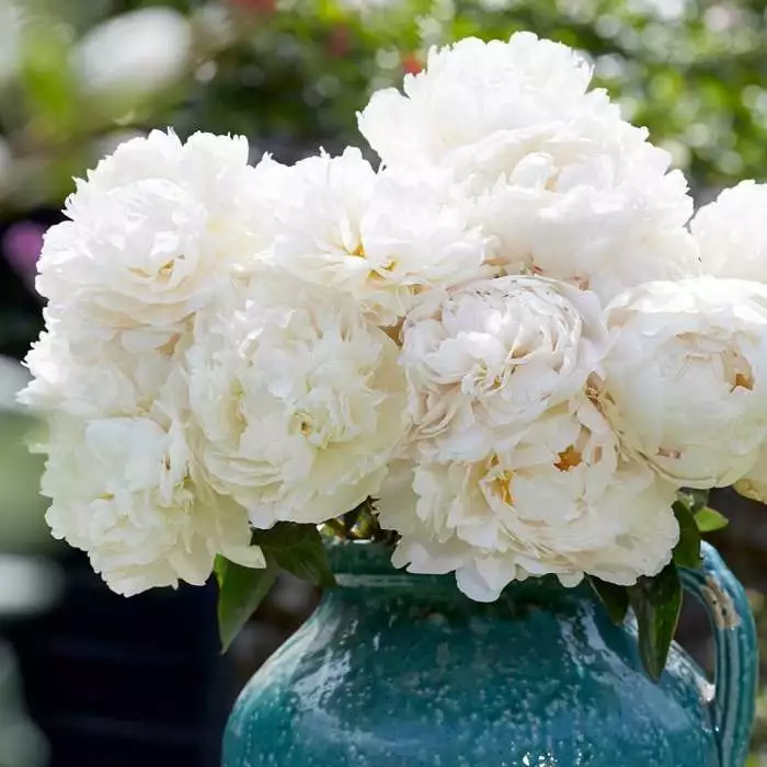 A double creamy-white, bare-root peony . Position: full sun or partial shade Soil: fertile, moisture-retentive yet well-drained Rate of growth: average Flowering period: June to July Hardiness: fully hardy Prized for their blowsy, glamorous blooms and glossy, deeply cut foliage, ‘Bowl of Cream’ is a stunning, scented peony for early summer. The blooms are so tightly packed that the golden stamens are all but hidden by the delicately ruffled inner petals. Fill the ground around the peony before the leaves appear with spring bulbs to prolong the season of interest. Garden care: Plant out as soon as possible after delivery, in a sunny spot with well-prepared soil. When placing your plant, make sure that the buds are facing upwards, and that these are no more than 2cm (1″) below the soil surface. Water in well after planting. Then, in early spring, apply a balanced slow-release fertiliser around the base of the plant and mulch with well-rotted compost or manure. Deadhead after flowering and remove tatty foliage in the autumn as it dies back.