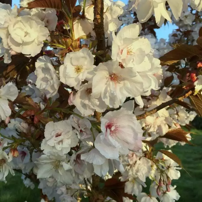 A semi-double flowering cherry . Position: full sun Soil: tolerates most soils Rate of growth: average Flowering period: April to May Hardiness: fully hardy Large, highly scented semi-double flowers open white and become pink-flushed later in the spring. The award-winning ‘Shizuka’ is a medium, vase-shaped, deciduous tree with bronze-coloured spring foliage that turns mid-green in midsummer and then orange in the autumn. Garden care: Plant ‘Shizuka’ as soon as conditions allow (avoiding frozen and waterlogged soil). Choose a sheltered spot to protect emerging blossom. Incorporate lots of well-rotted garden compost in the planting hole and stake and support firmly. Prune in summer to reduce the risk of silver leaf and bacterial canker. Cut back any dead, diseased or crossing branches.