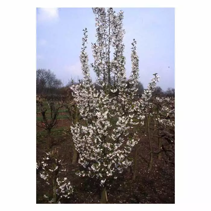A narrow small upright tree. Green leaves followed by lovely single white flowers in early April.
