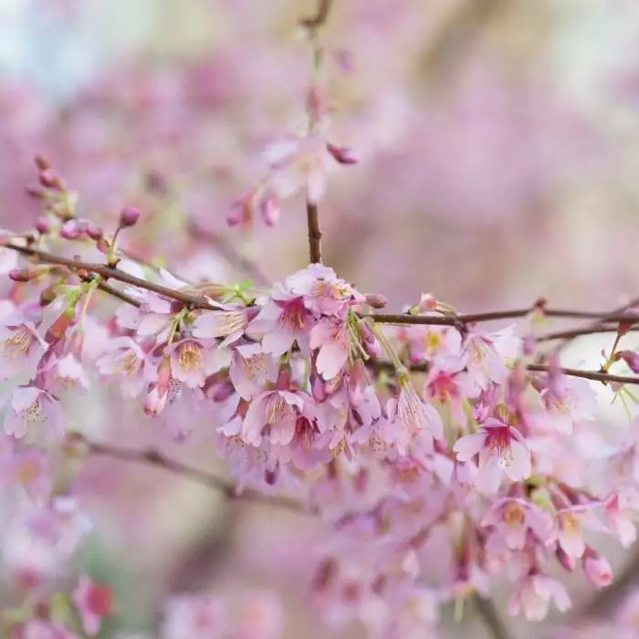 Charming cherry tree with masses of flowers. Position: full sun Soil: moist, well-drained fertile soil Rate of growth: vigorous Flowering period: March Hardiness: fully hardy A bushy tree or shrub with sharply toothed dark green leaves turning vibrant shades of orange and red in autumn. Fragrant carmine pink flowers are produced in profusion in early spring. A lovely early-flowering cherry which looks great, even in small gardens. Garden care: When planting incorporate lots of well-rotted garden compost in the planting hole and stake firmly. Prune in summer to reduce the risk of silver leaf and bacterial canker, cutting back any dead, diseased or crossing branches.